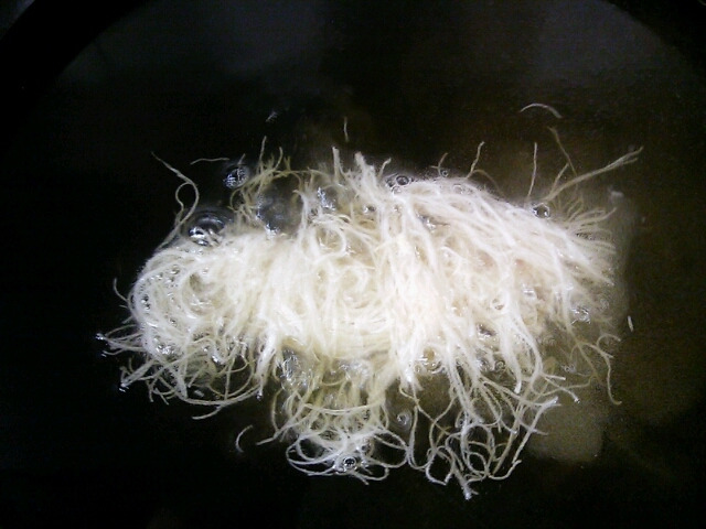 [あまり高い温度で揚げてしまうと、カダイフだけが真っ黒になってしまい、エビが生のままになってしまうので気をつけてくださいね]じゅる・・え゛!え゛!