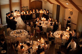 おふたりから最後にまわるテーブルのみんなには前に出てきてほしいという希望がありそれぞれの端の方から順番にキャンドルをリレーして頂き皆様で繋がれた火がおふたりのもとへ