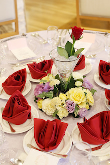 淡いパープルのテーブルクロスにバラ折りにした赤いナフキンを合わせました
