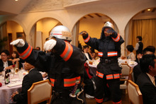 火災役のご友人に実際にお水をかけ、会場中は驚きと笑いが