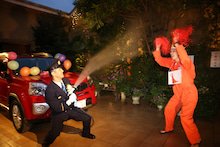 サイレンの音と共に消防車に見立てた赤い車が登場