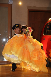 無事消火した後は後部座席に乗っていたご新婦様をお姫様抱っこで降ろし、改めて披露宴会場にご入場です