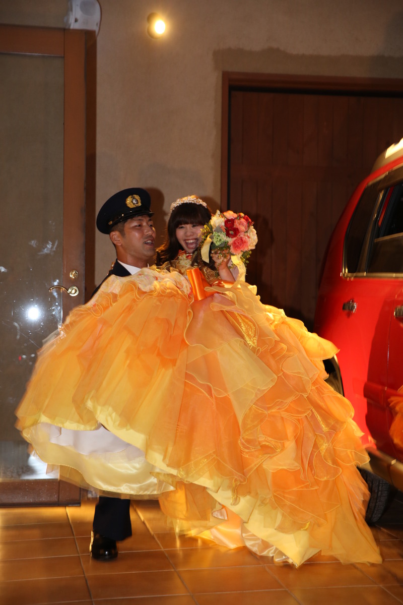 無事消火した後は後部座席に乗っていたご新婦様をお姫様抱っこで降ろし、改めて披露宴会場にご入場です