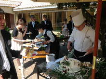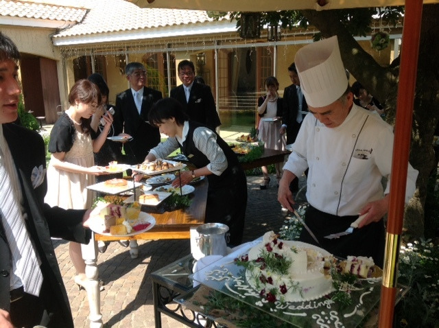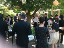 ご新郎ご新婦もお庭に出てきて皆様と一緒にワイワイ会話をしたり、お写真を撮ったりなどとても楽しそうでした