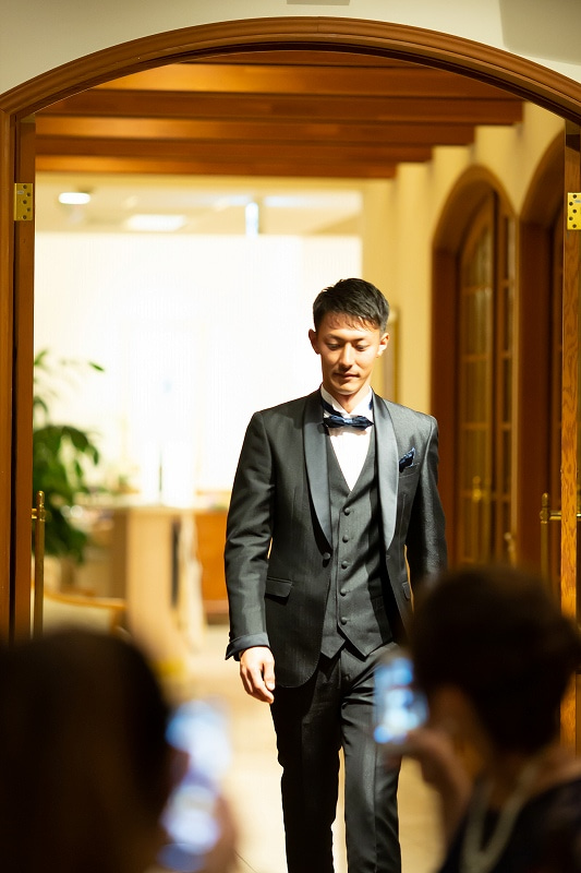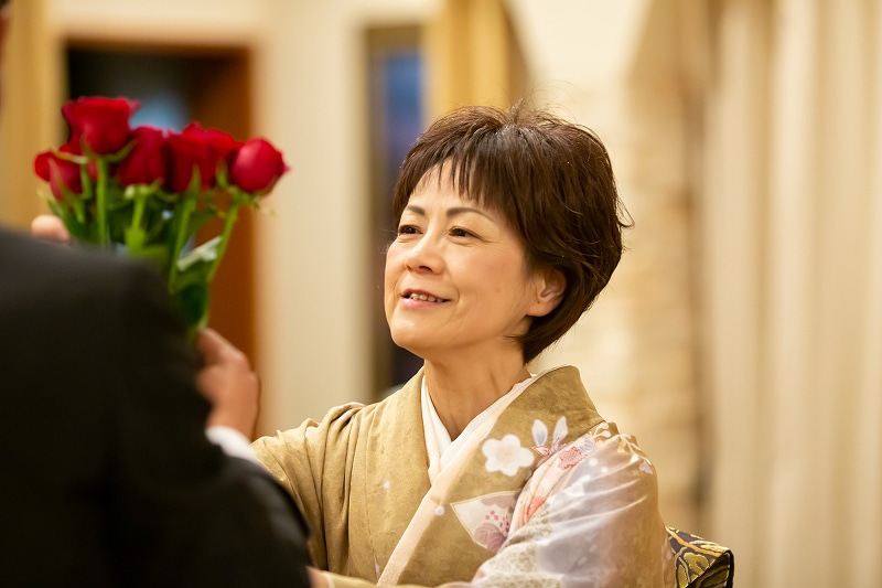 花束を受け取りOKのサインにその中から1本抜いて胸ポケットに差し込んだ花がブートニア