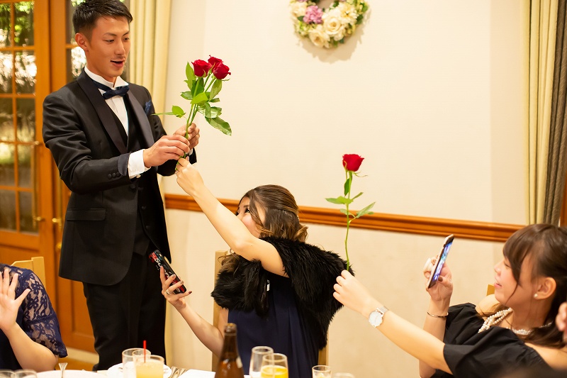 赤い100本のバラと共にプロポーズを受けたと伺った私はパーティーでも再現してもらっちゃいましょう!とブーケブートニアの儀式を提案