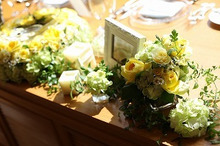 メインテーブルにはイエロー、ホワイト、グリーンが三層になったリースタイプ