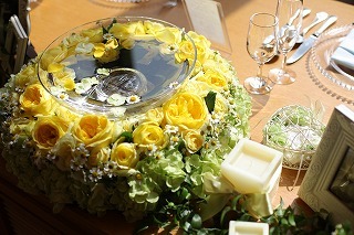 メインテーブルにはイエロー、ホワイト、グリーンが三層になったリースタイプ