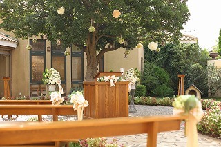 ガーデンは人前式のためシンボルツリーにホワイト、グリーンのボール花や