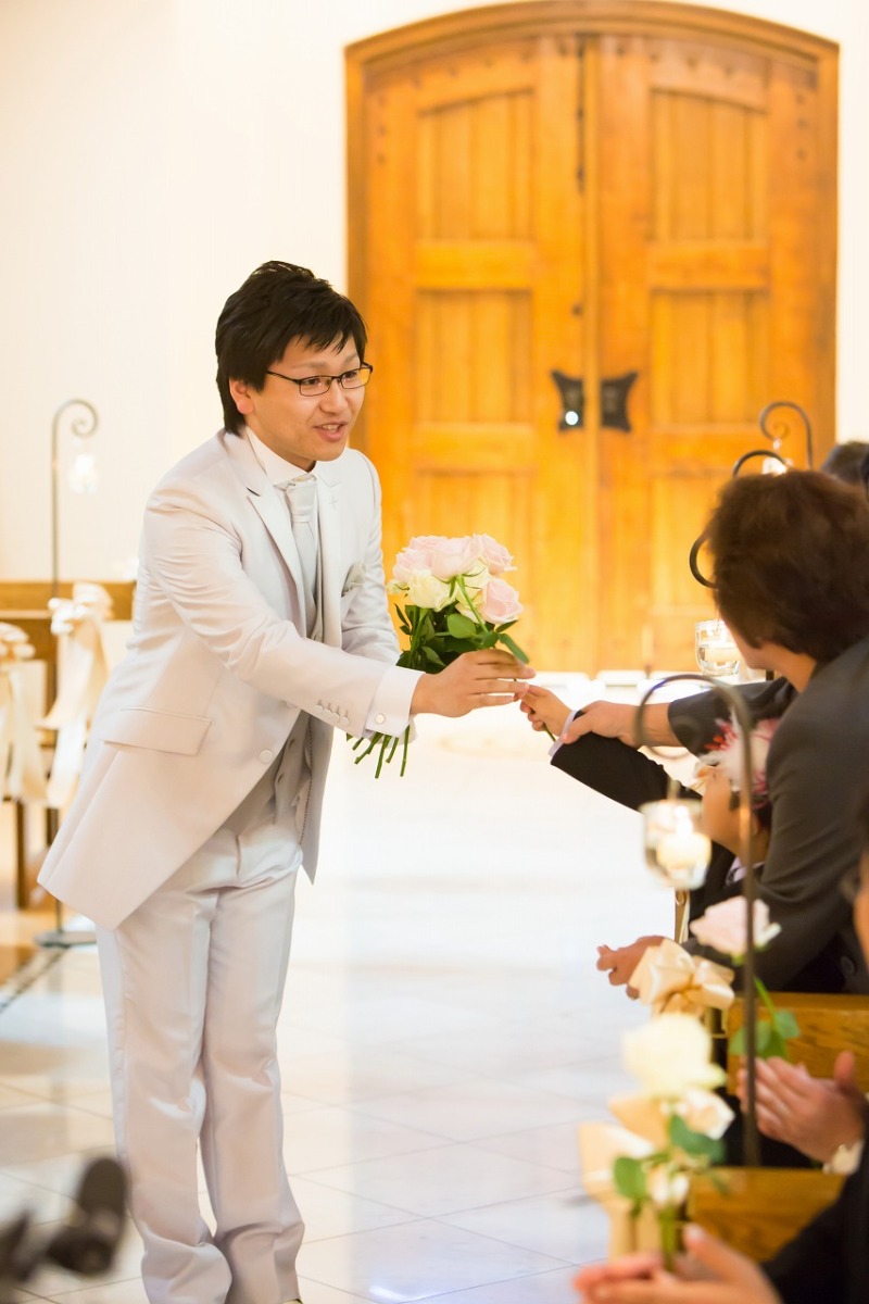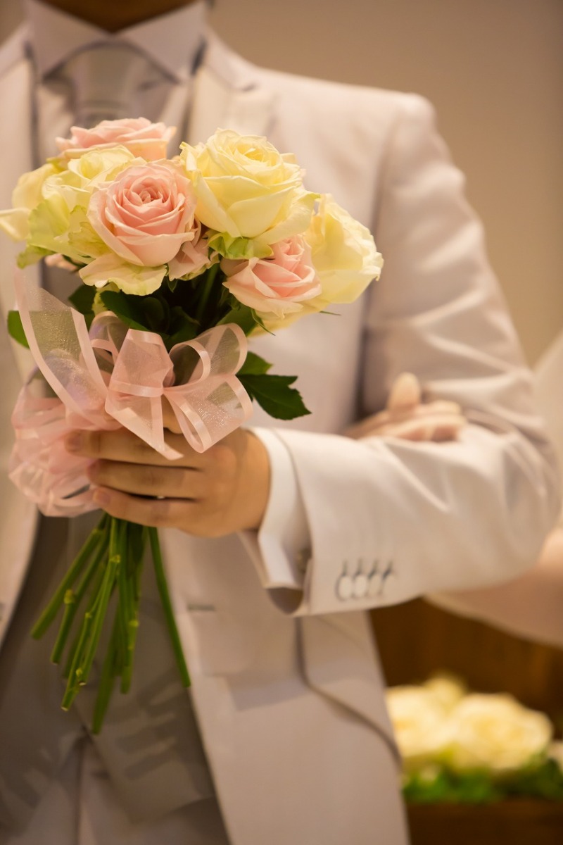 「Yes」の証として花束から1輪抜いてご新郎の胸ポケットに