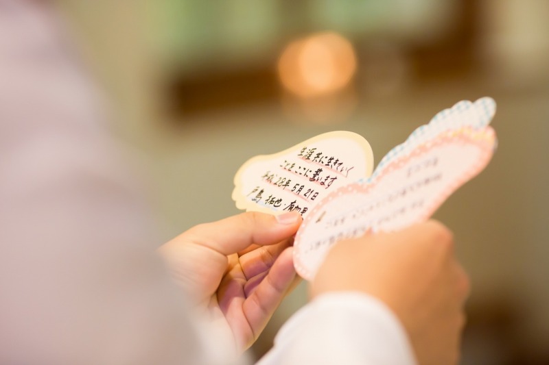 オリジナルで考えた誓いの言葉を天使の羽に綴り、ゲストにご披露天使の羽