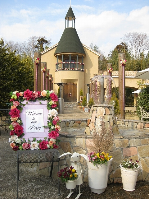 明るい花いっぱいで飾ったウェルカムボード