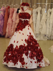斬新ですが、真っ白なドレスに赤いバラの花びら