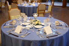 ご披露宴会場は青いクロスと白いナプキン!シンデレラのイメージ。