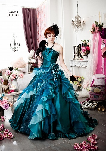 ここ何年もエスポワールで人気上位にいるカラードレスもブルーグリーンのドレスなんです
