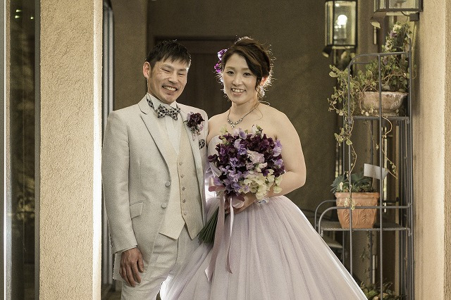 淡い紫のやさしい雰囲気のドレスと可愛らしいご新婦様にぴったりで、とても印象的でした。