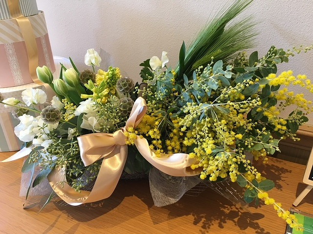 ミモザの黄色とあざやかなグリーンが明るく、春らしい印象に!