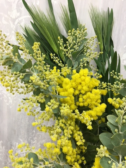 ミモザだけで束ねてもかわいいですが麦と合わせても。
