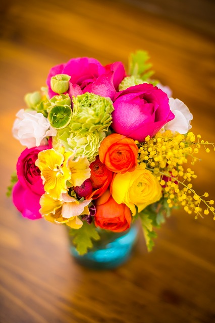ミモザの黄色とあざやかなグリーンが明るく、春らしい印象に!