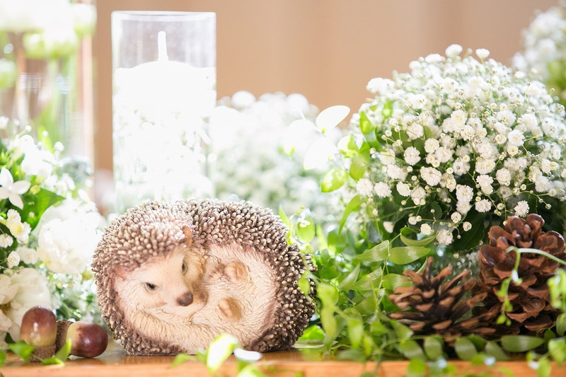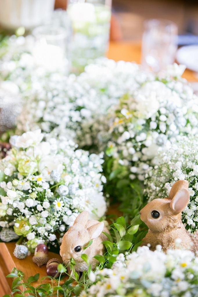 お花は大好きなかすみ草をメインに使用し、森の中に動物たちも祝福しにきてくれたような