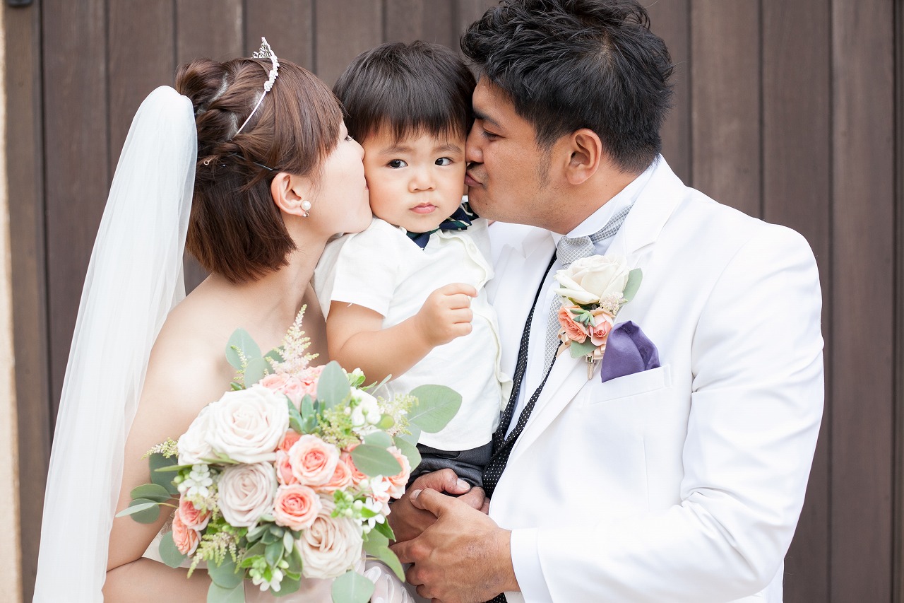 まず、ご新婦様のご希望でお二人がお子様を抱っこしてほっぺにちゅーの写真