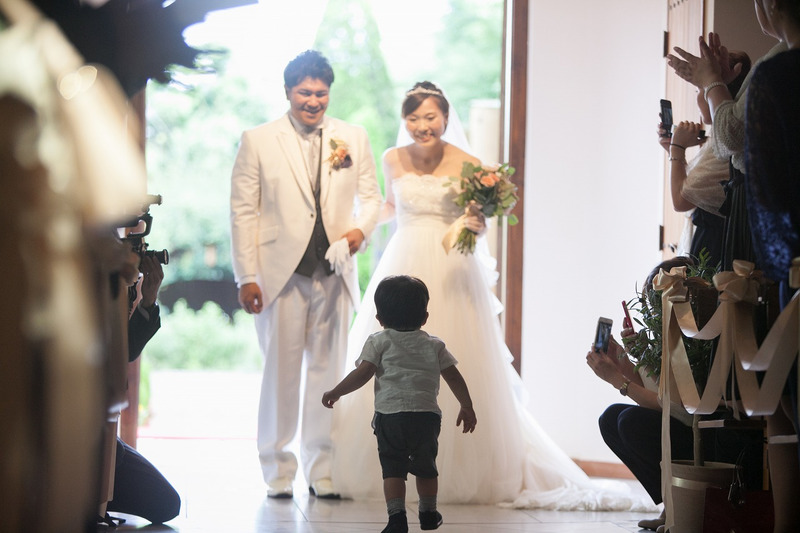 そしてお式終了の退場時もチャペルから出て行くパパママを追いかけて一緒に退場