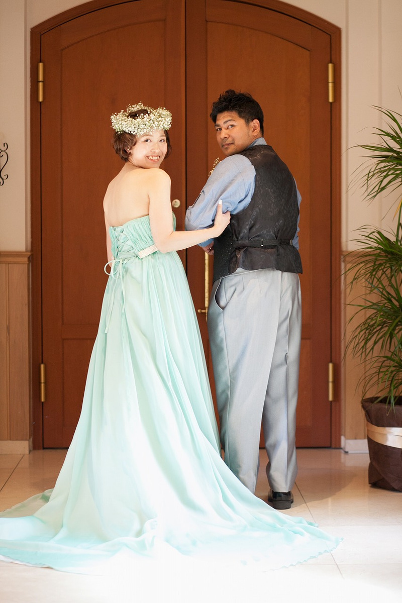 衣裳にもこだわったお二人は披露宴入場でカラードレスにチェンジ!
