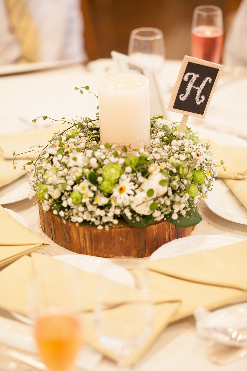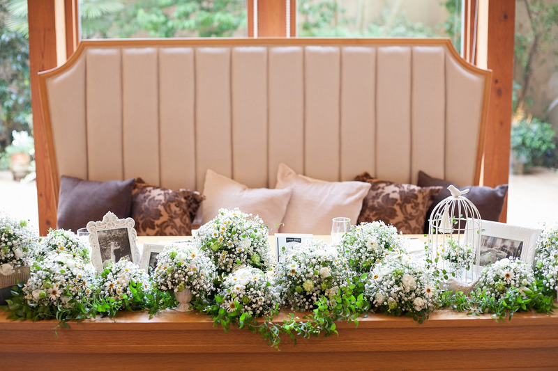 メインテーブル、ゲストテーブルのお花にもかすみ草をふんだんに使いました