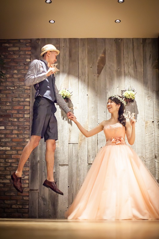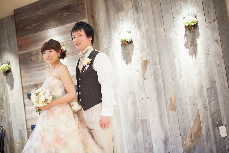淡いピンクとイエローの色合いが優しい印象のカラードレス。