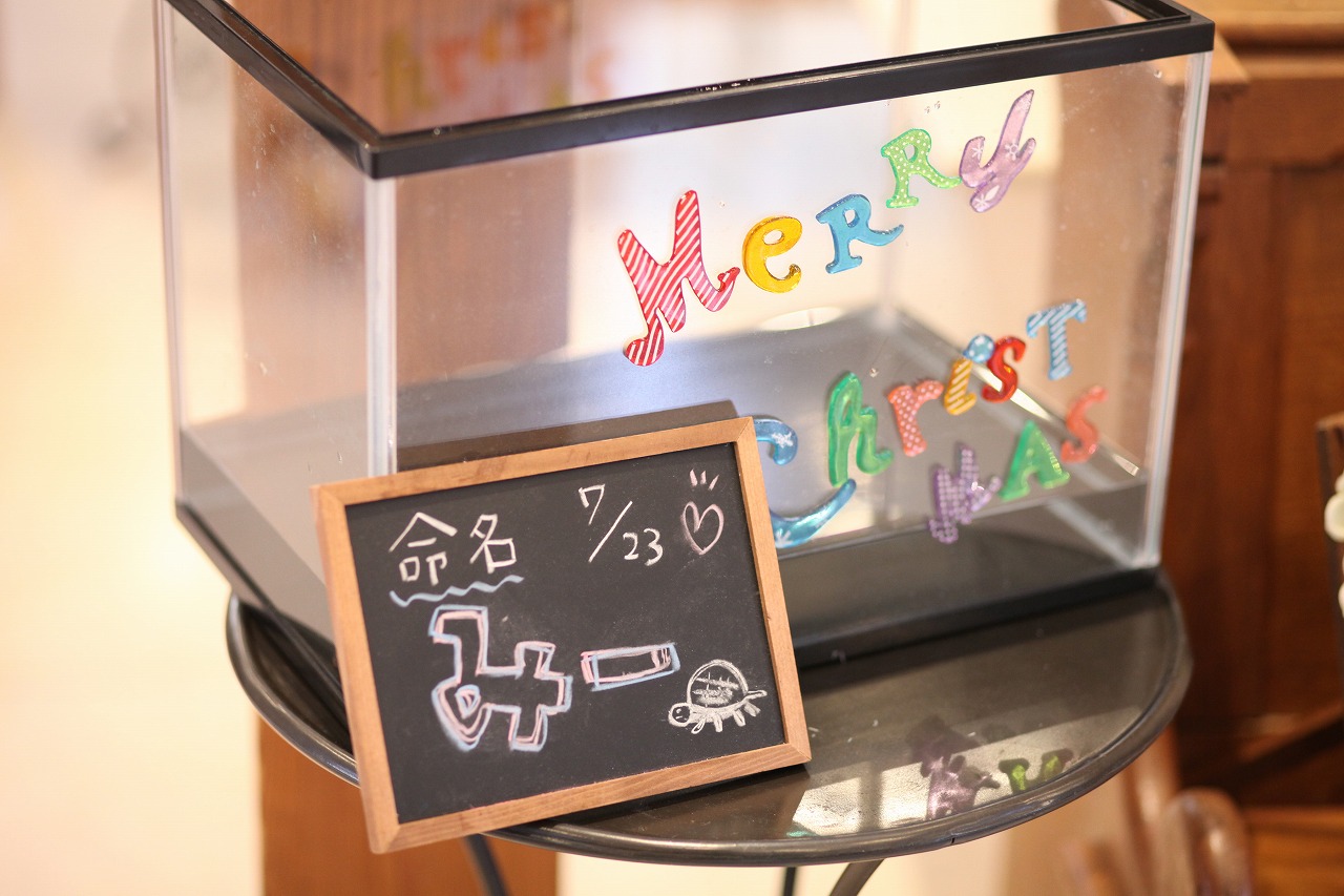 “ウェルカム”ならぬ“ウェルカメ”ということで、みーちゃんの水槽もクリスマス仕様![]()