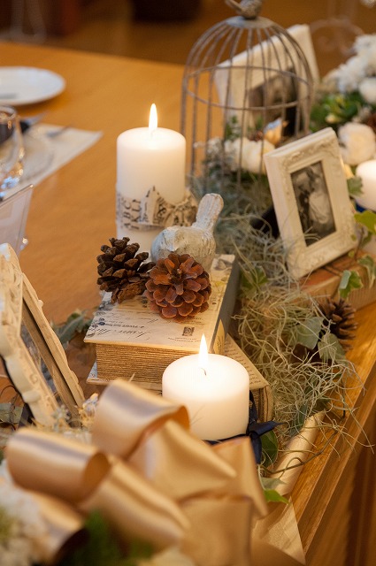 会場に入るとメインテーブルの装飾は松ぼっくりで装飾![]()