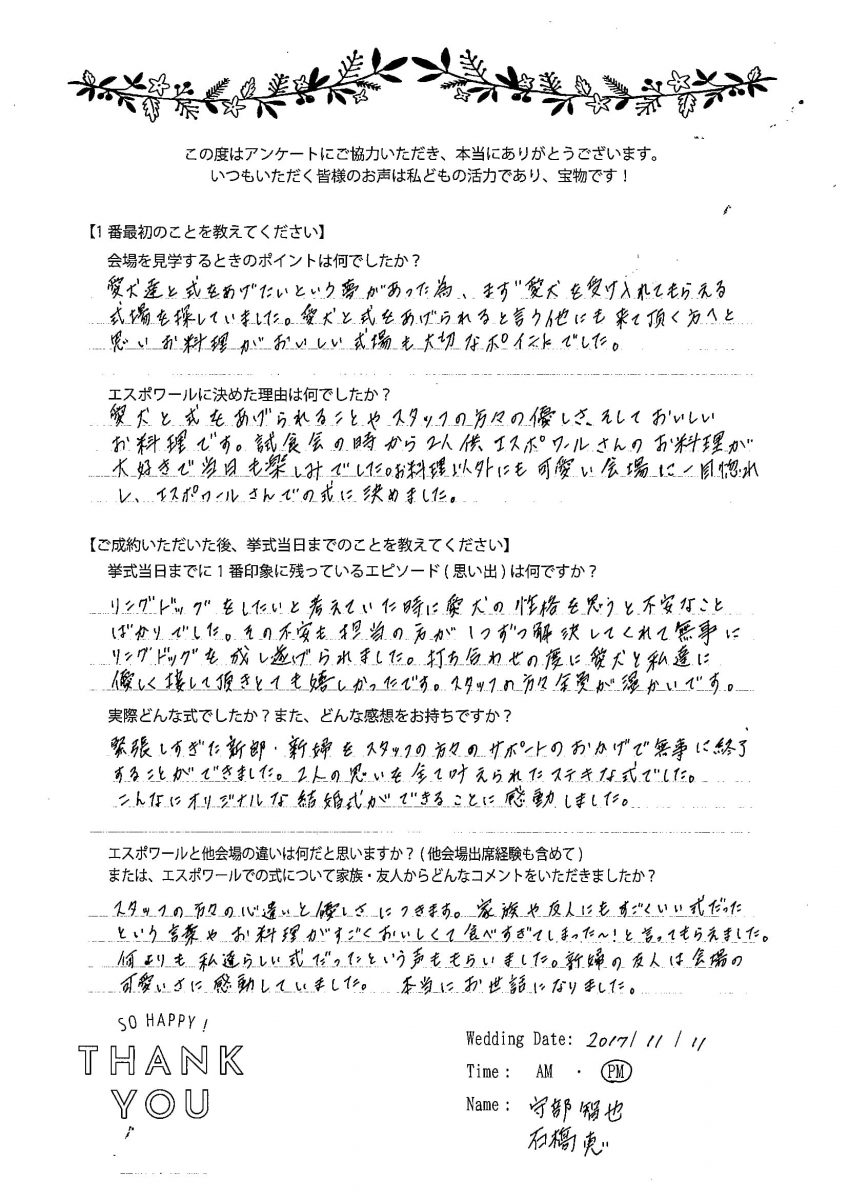 リングドッグをしたいと考えていた時に、愛犬の性格を思うと不安なことばかりでした。その不安も担当の方が1つずつ解決してくれて無事にリングドッグを成し遂げられました。打ち合わせの度に愛犬と私達に優しく接して頂きとても嬉しかったです。スタッフの方々全員が温かいです。