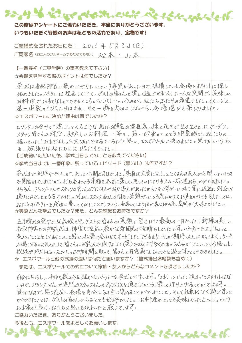 ロクシタンの香りが漂ってくるような南仏の邸宅の雰囲気、緑と花々が生き生きとしたガーデン、 スタッフ皆さんの対応、美味しいお料理…等々、第一印象がとても印象的で、 私たちの描いていた「おもてなし」を大切にできるところだと思い、エスポワールに決めました。