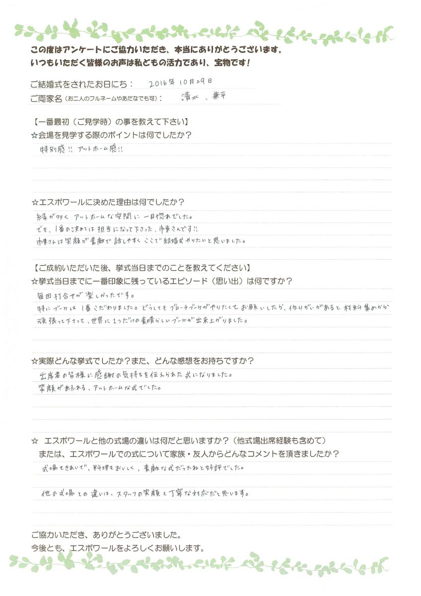 または、エスポワールでの式について家族・友人からどんなコメントを頂きましたか?