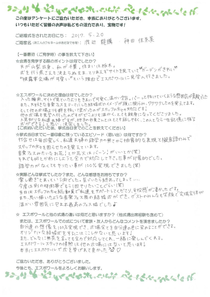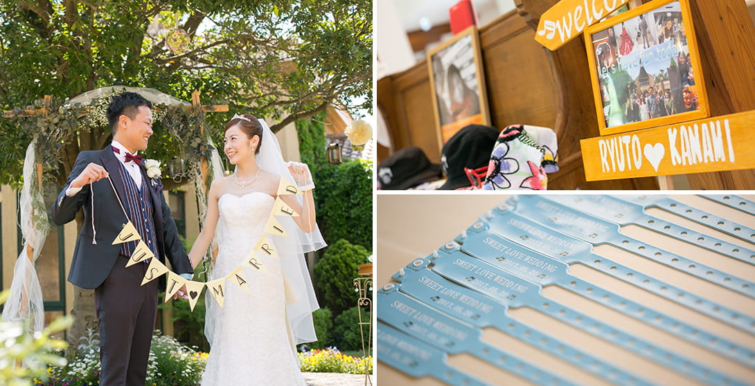 入った瞬間、サイトで見ていたよりもきれいで可愛く、温かい空気。パーッと抜けていくような雰囲気が素敵でした。また、大好きな音楽フェスをテーマにした結婚式のイメージが頭に膨らみ、ワクワクしたのを覚えてます。