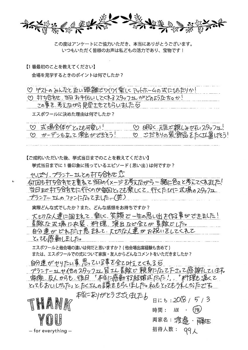 または、エスポワールでの式について家族・友人からどんなコメントを頂きましたか?