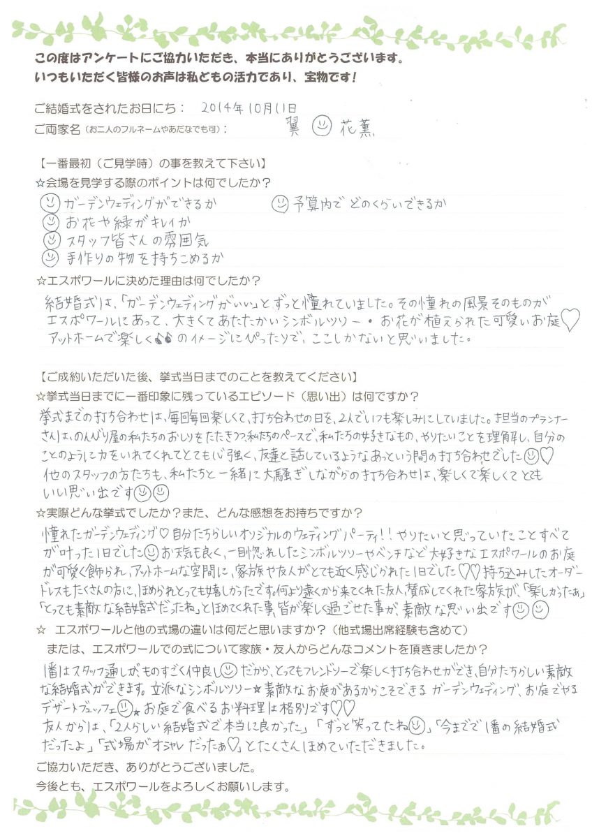 やりたいと思っていたことすべてが叶った1日でした。 お天気も良く、一目惚れしたシンボルツリーやベンチなど大好きなエスポワールのお庭が可愛く飾られ、 アットホームな空間に、家族や友人がとても近く感じられた1日でした。