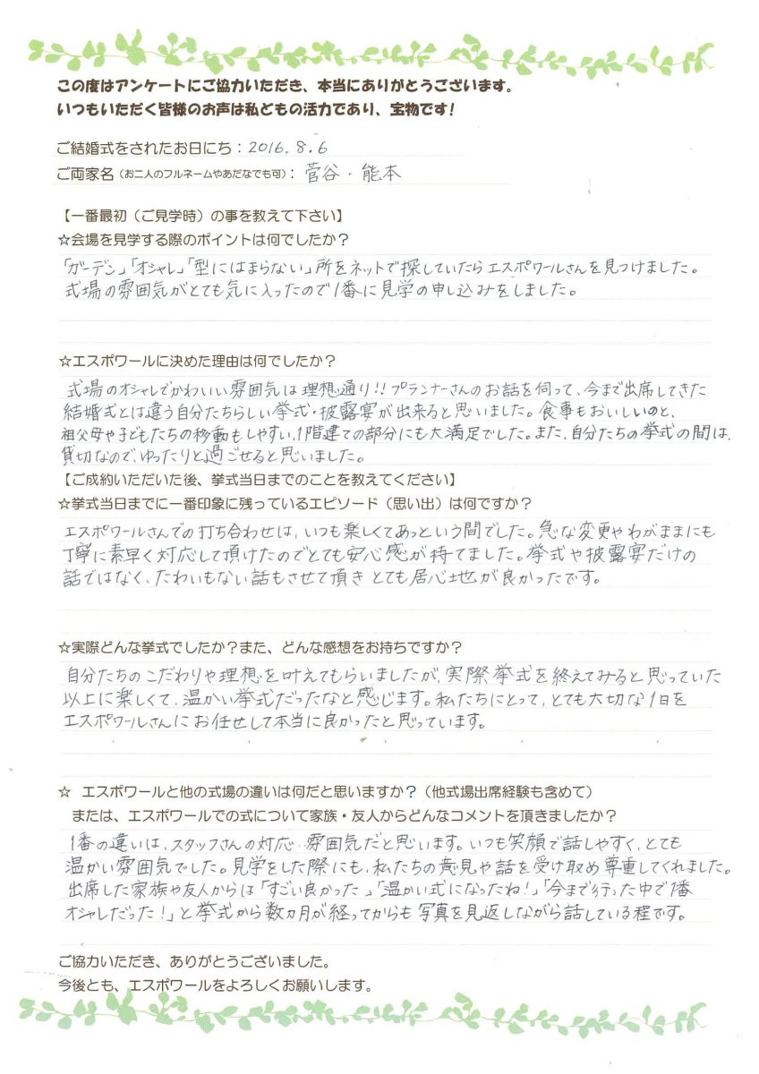 自分たちのこだわりや理想を叶えてもらいましたが、実際挙式を終えてみると思っていた以上に楽しくて、温かい挙式だったなと感じます。私たちにとって、とても大切な1日をエスポワールさんにお任せして本当に良かったと思っています。
